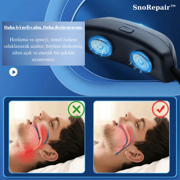 SnoRepair™, uyku sırasında çöken hava yolu kaslarını yeniden eğitmek ve güçlendirmek için güvenli ve klinik olarak kanıtlanmış EMS teknolojisini kullanır. Düzenli kullanımla, kas tonusunu doğal olarak geri kazanır Uyku Apnesini ve Horlamayı kökünden yok edersiniz. Hantal maskelere, ağrılı ağızlıklara ve invaziv prosedürlere gerek yok.